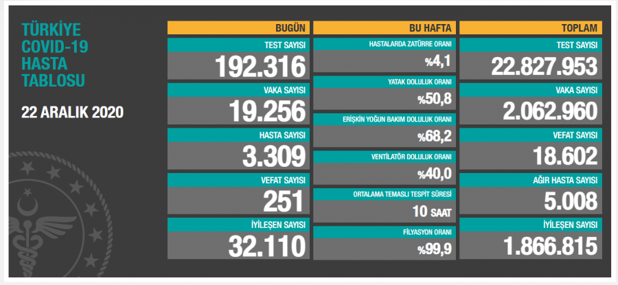 Türkiye'de son 24 saatte 192 bin 316 Kovid-19 testi yapıldı, 19 bin 256 kişinin testi pozitif çıktı, 251kişi hayatını kaybetti.