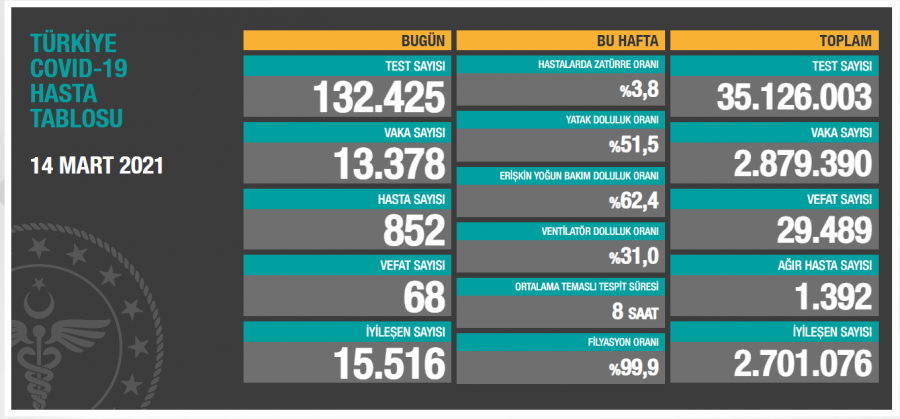 Haftalık verilere göre, bu hafta hastalarda zatürre oranı yüzde 3,8, yatak doluluk oranı yüzde 51,5, erişkin yoğun bakım doluluk oranı yüzde 62,4, ventilatör doluluk oranı yüzde 31, ortalama temaslı tespit süresi 8 saat, filyasyon oranı yüzde 99,9 olarak kayda geçti.