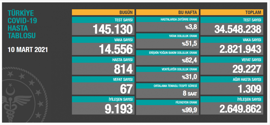 Ağır hasta 1309 oldu, 9 bin 193 kişinin Kovid-19 tedavisinin/karantinasının sona ermesiyle iyileşen sayısı 2 milyon 649 bin 862'ye yükseldi.