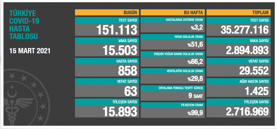 Türkiye'de son 24 saatte 151 bin 113 Kovid-19 testi yapıldı, 15 bin 503 kişinin testi pozitif çıktı, 63 kişi hayatını kaybetti.