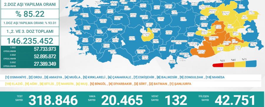 Sağlık Bakanlığı tarafından Türkiye'nin yeni korona virüs tablosu açıklandı. 12 Mart'ta açıklanan 24 saatlik verilere göre, 20 bin 465 vaka tespit edildi. Virüs nedeniyle hayatını kaybedenlerin sayısı 132 oldu. Bir günde toplam 318 bin 846 test yapılırken, iyileşen hasta sayısı 42 bin 751 olarak kaydedildi.
