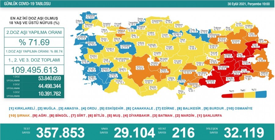 Bakanlığın tablosuna göre yüzde 46,4 ile Türkiye'de en az aşılamanın gerçekleştirildiği Şanlıurfa'yı, Mardin, Batman, Diyarbakır, Muş, Bitlis, Siirt, Bingöl, Ağrı ve Şırnak takip etti.