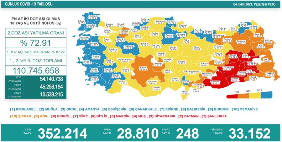 5 Ekim'de açıklanan 24 saatlik verilere göre 29 bin 802 vaka tespit edildi. Virüs nedeniyle hayatını kaybedenlerin sayısı 228 oldu. Bir günde toplam 355 bin 564 test yapılırken, iyileşen hasta sayısı 32 bin 269 olarak kaydedildi. Sağlık Bakanlığı tarafından açıklanan tabloda, aşılama verilerine de yer verildi. En az 2 doz aşısını olmuş 18 yaş üzeri nüfusu kapsayan verilere göre Türkiye'de 2. doz aşılama ortalama yüzde 73,23 oldu. 1. doz ortalaması yüzde 87,34 olurken, 1., 2. ve 3. doz aşısını olan vatandaş sayısı toplamda 10 milyon 586 bin 681'e yükseldi.