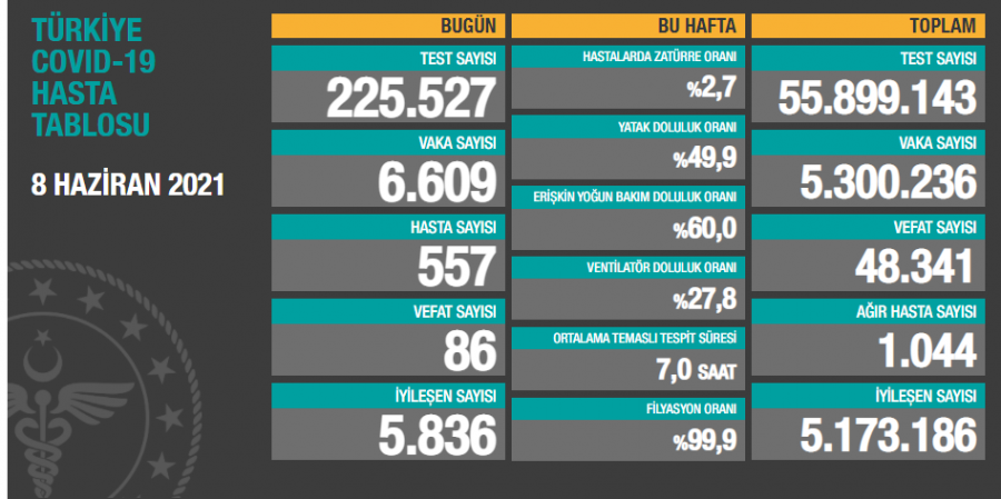 Türkiye'de son 24 saatte 225 bin 527 Kovid-19 testi yapıldı, 6 bin 609 kişinin testi pozitif çıktı, 86 kişi hayatını kaybetti.