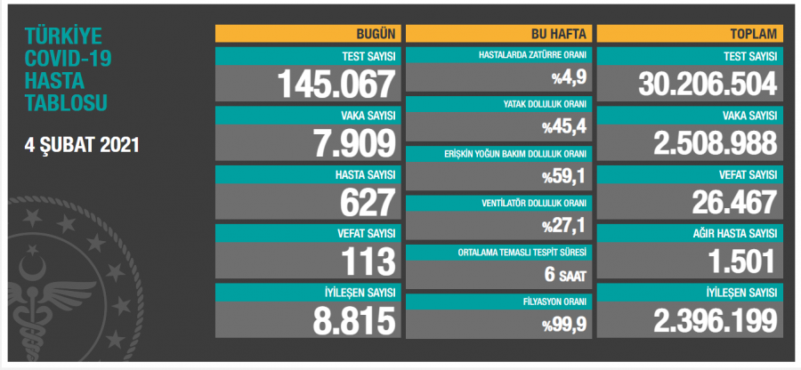 Ağır hasta 1501 oldu, 8 bin 815 kişinin Kovid-19 tedavisinin/karantinasının sona ermesiyle iyileşen sayısı 2 milyon 396 bin 199'a yükseldi.