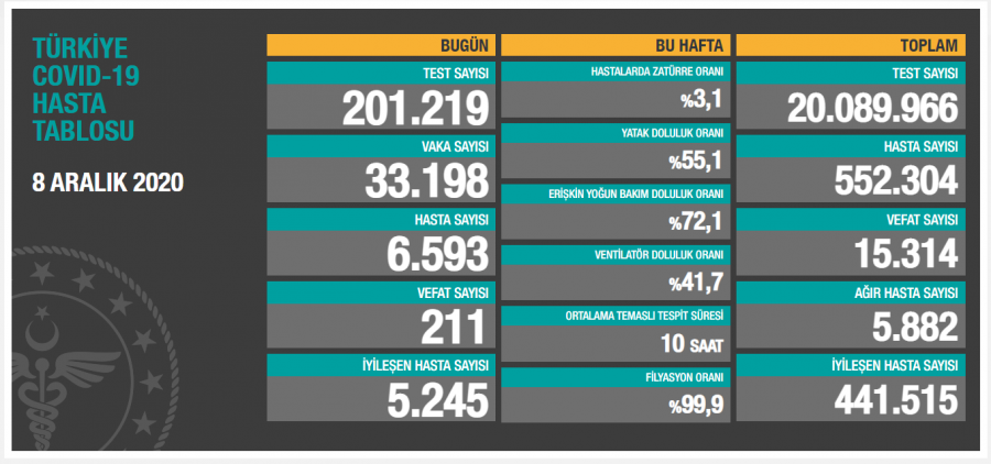 Fahrettin Koca'nın da sosyal medyadan açıkladığı gibi 8 Aralık Salı günü korona tablosuna göre, 6.593 hasta sayısına ulaştı. 33.198yeni vaka tespit edildi ve 211 kişi hayatını kaybetti. 5.245 hasta ise iyileşti.