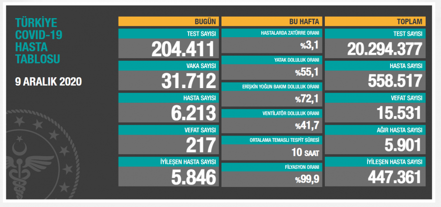 Sağlık Bakanlığı koronavirüs tablosu günlük olarak açıklanıyor. Son olarak 8 Aralık günü açıklanan verilere göre 6.593 vaka sayısı tespit edildi ve 211 kişi hayatını kaybetti. 9 Aralık koronavirüs tablosuna göre; 204 bin 411 test yapıldı 31 bin 712, vefat eden sayısı 217'ye ulaştı.