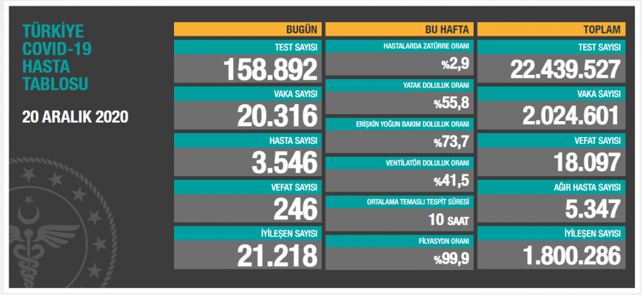 Türkiye'de son 24 saatte 158 bin 892 Kovid-19 testi yapıldı, 20 bin 316 kişinin testi pozitif çıktı, 246 kişi hayatını kaybetti.