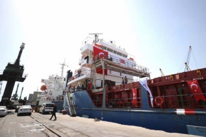 İsrail saldırılarının hedefi olan Gazze şeridindeki Filistin halkı için hazırlanan 125 bin gıda kolisinin bulunduğu 2 bin 960 tonluk yardımlar, rıhtımda konuşlu "SARDES" adlı gemiye yüklendi.