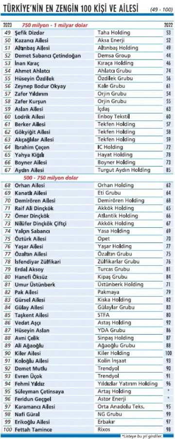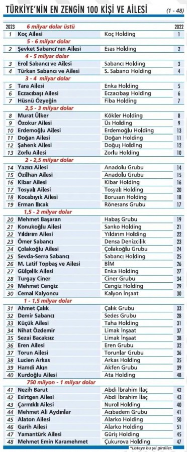 Ekonomist dergisinin hazırladığı listeye göre Türkiye'nin en zengin 100 ismi ve ailesi belli oldu.
