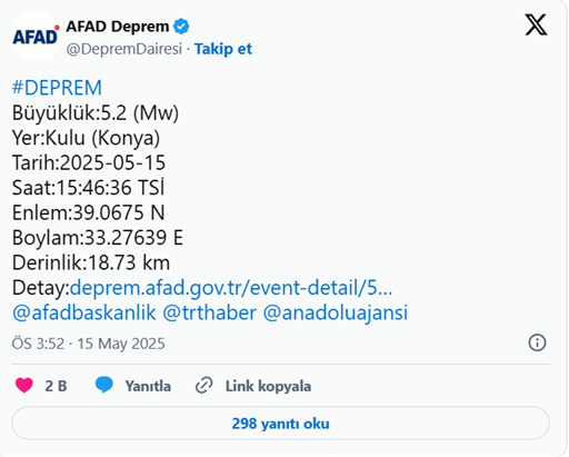 İçişleri Bakanı Ali Yerlikaya, "Konya Kulu'da 5.2 büyüklüğünde bir deprem meydan gelmiştir. Çevre illerden de hissedilen depremle ilgili olarak, AFAD ve ilgili kurumlarımızın tüm ekipleri derhal saha taramalarına başlamıştır. An itibarıyla herhangi olumsuz bir durum bulunmamaktadır. Depremden etkilenen vatandaşlarımıza geçmiş olsun dileklerimi sunuyorum. Allah ülkemizi ve milletimizi afetlerden korusun." açıklamasını yaptı.