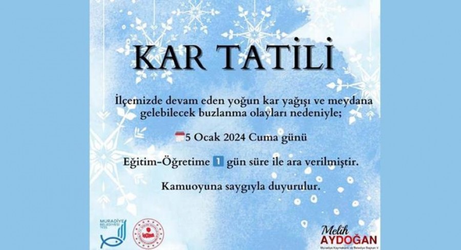 Muradiye ve Saray Kaymakamlıkları tarafından sosyal medya hesaplarından yapılan paylaşımda, "Yaşanan yoğun kar yağışı sebebi ile ilçe genelinde tüm resmi ve özel, örgün ve yaygın eğitim, okul ve kurumlarımızda 5 Ocak 2024 Cuma günü 1 gün süre ile eğitime ara verilmiştir" denildi.