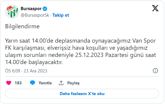Van'a karayoluyla gitmesi gereken Bursaspor'un resmi erteleme talebini değerlendiren Futbol Federasyonu, mücadelenin 25 Aralık Pazartesi günü aynı saatte oynanmasına karar verdi.