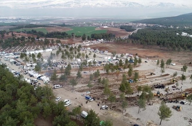 Depremde çöken binaların enkazında arama-kurtarma çalışmalarının halen sürdüğü Kahramanmaraş’ta hayatını kaybeden kişiler için Kapıçam Mezarlığı’nda iş makineleriyle yan yana binlerce mezar açıldı.