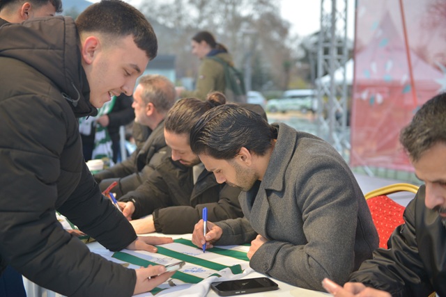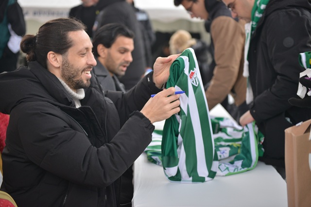 Öte yandan Bursaspor Başkanı Enes Çelik, Teknik Direktör Tahsin Tam ve futbolcular Taha Batuhan Yayıkçı, Muhammed Demir ve İlhan Depe de Yeni Yıl Meydanı’nda düzenlenen imza gününde taraftarlarla bir araya geldi. Programa yoğun ilgi gösteren yeşil beyazlı taraftarlar, uzun kuyruklar oluşturarak tezahüratlar eşliğinde forma ve atkılarını imzalattırdı. Bursaspor’a olan sevgilerini bir kez daha gösteren taraftarlar, gönül verdikleri takımın futbolcularıyla fotoğraf çektirme imkanı buldu. Kendilerine gösterilen ilgiden memnuniyet duyduklarını ifade eden futbolcular, taraftar desteğinin kendileri için büyük bir motivasyon kaynağı olduğunu belirtti. Bursa Büyükşehir Belediyesi’nin ‘Mücadelede Yanındayım’ diyerek destek verdiği organizasyon, yeşil-beyazlı renklere olan bağlılığı da güçlendirdi.