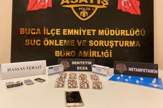 Buca İlçe Emniyet Müdürlüğüne bağlı Narko Alan ekipleri, uyuşturucu ticareti yapan şahıslara yönelik yürüttüğü çalışmalarda şüphe üzerine motosikletle yoldan geçen H.G.'yi durdurdu. Yapılan aramada ise, satışa hazır hale getirilmiş metamfetamin maddeleri ve yeşil reçeteye tabi 112 sentetik hap ve hassas terazi ele geçirildi. Öte yandan sorgusu yapılan H.G.'nin motosikletinin de çalıntı motosiklet olarak arandığı ortaya çıkarken şüpheli polis tarafından gözaltına alındı.